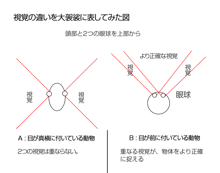 これに反して捕食動物は物体の動きを正確に捉える必要がある為に、目(眼球)が前に2つという進化をしたらしい。