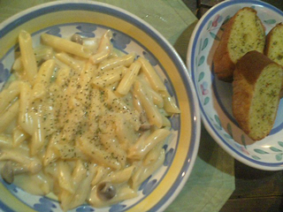 これはゴルゴンゾーラのペンネとガーリックトースト。