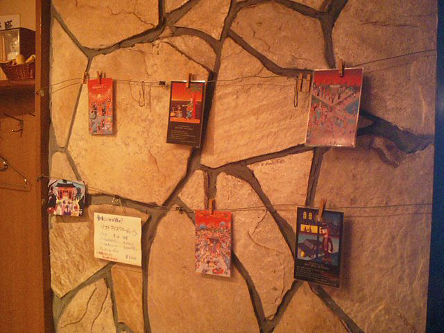 今ね、ピッコロマーゴの一角は、こんなふうに僕のポストカードが飾ってあるよ。
