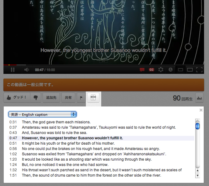 この翻訳キャプションはいつでも切り替える事が出来るし、この字幕キャプションを元にして、他言語に再翻訳する事が可能です。