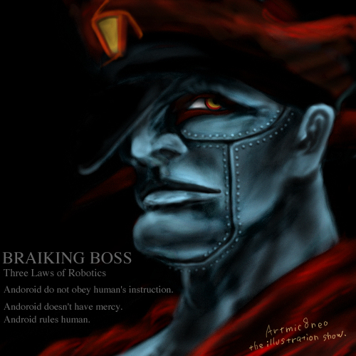 イラスト中の英文はアシモフの『ロボット工学3原則』をブライキング・ボス用に加工して作ってみたよ。言いそうじゃない?(笑)