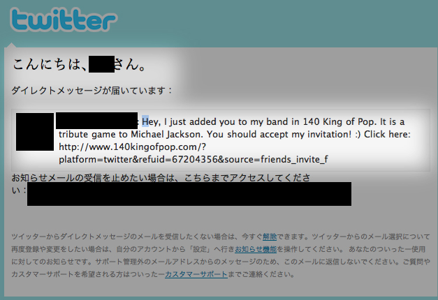 この通知はある程度メールの内容が読めるので、確認した上でTwitterのメッセージを開くようにすれば、自分が送信者にあることはないね。