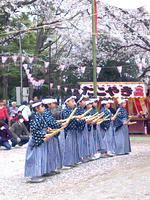 満面の桜の中に土俵が位置し、鳥居から境内の細長い道を獅子がゆく。